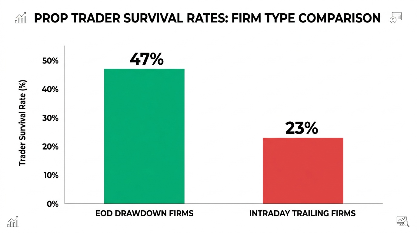 New 2026 data reveals EOD drawdown rules nearly double prop trader survival rates vs intraday trailing. Full breakdown, firm comparisons & strategy tips.
